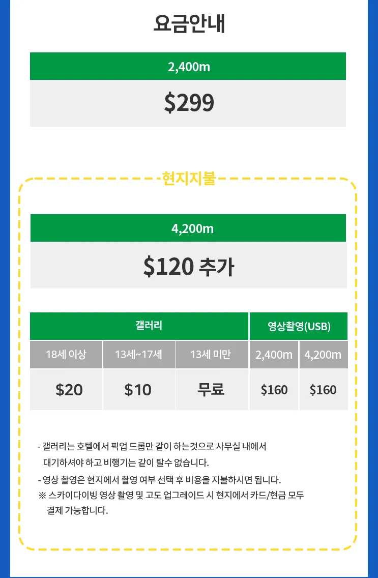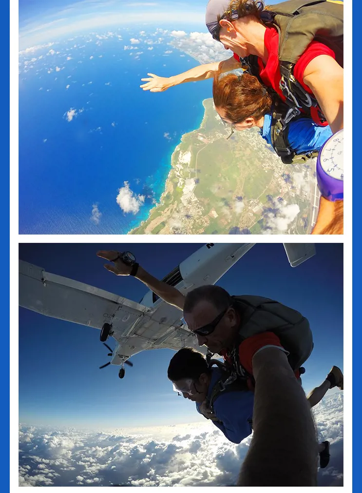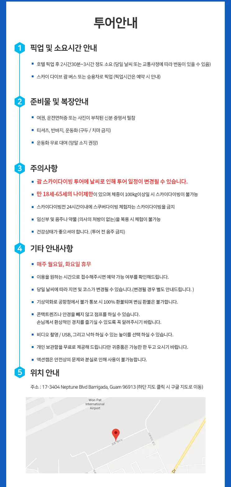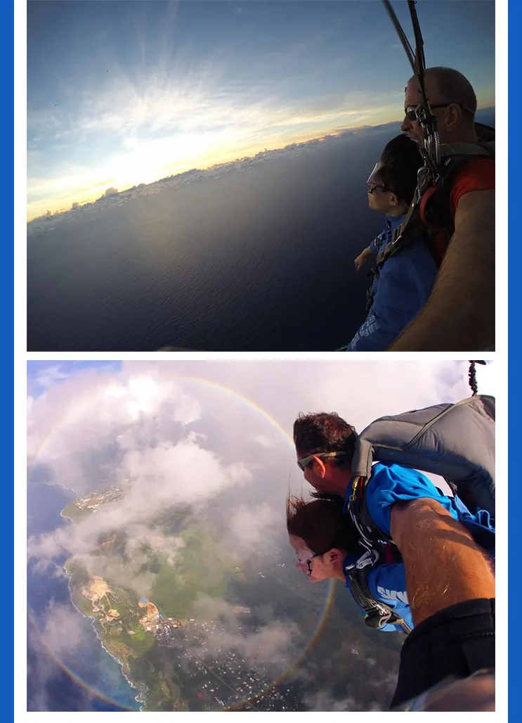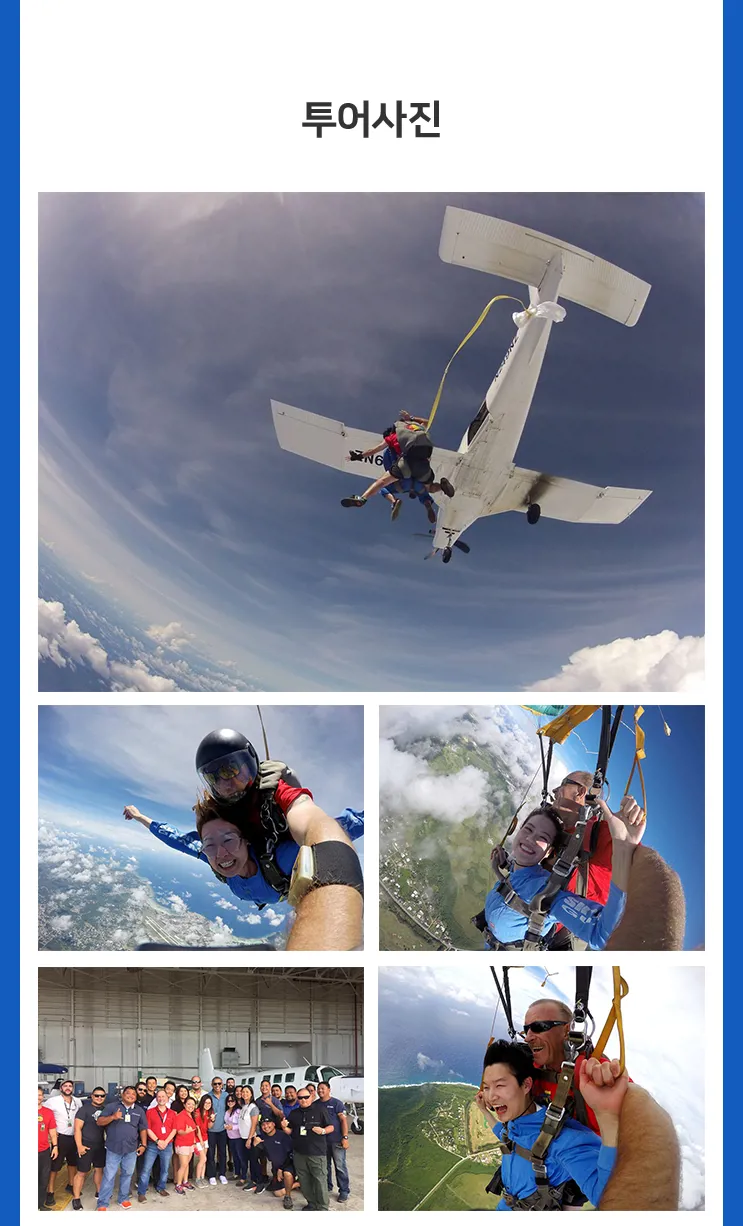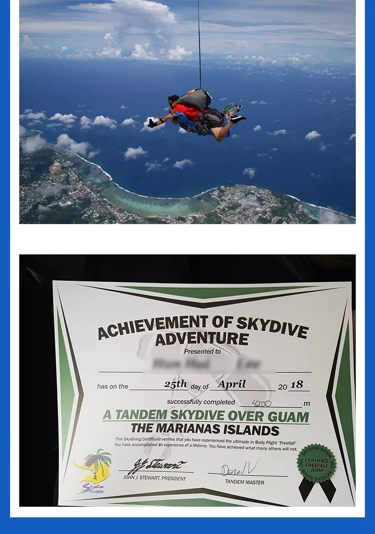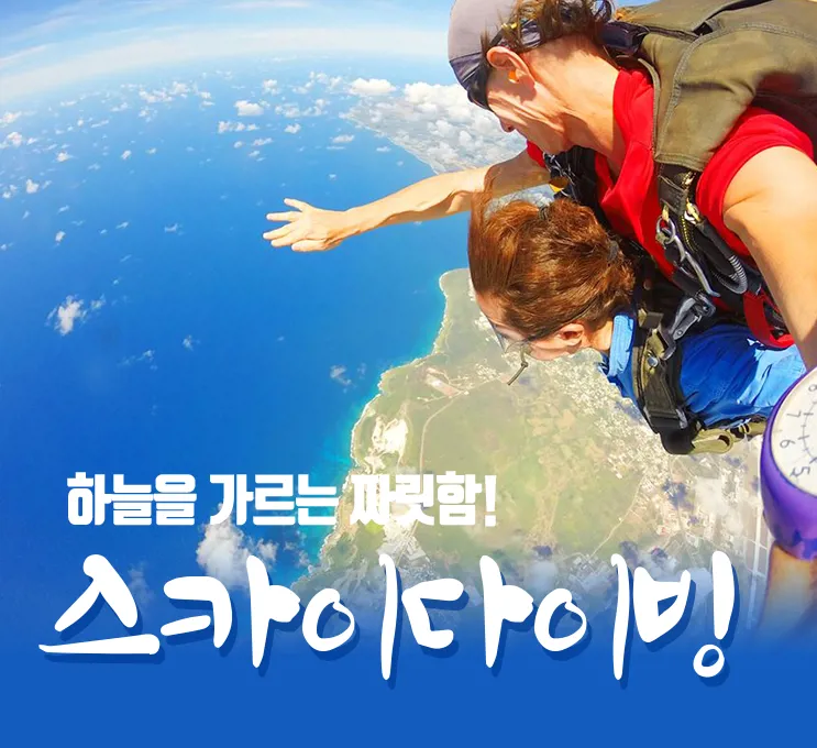 누구나 가지고 있는 버킷리스트 중 하나여서 큰맘 먹고 예약 했어요 날씨도 좋았고 좀 떨리긴 했지만 정말 꿈만 같은 시간이었습니다 딱! 강사님이랑 뛰는데 어후 한 5초?? 정도는 숨을 못쉬었어요 그후에는 괌이 통째로 보이더라구요 너무 아름 다웠고 행복했어요 저는 4800미터 현장에서 추가 하고 뛰었어요 인생에 한번은 꼭! 하세요!!!! 전 두번은 안할꺼니까요!!! ㅋㅋㅋㅋ