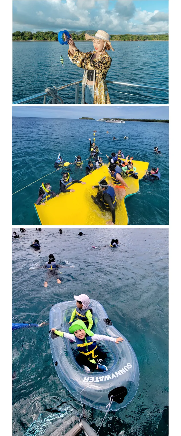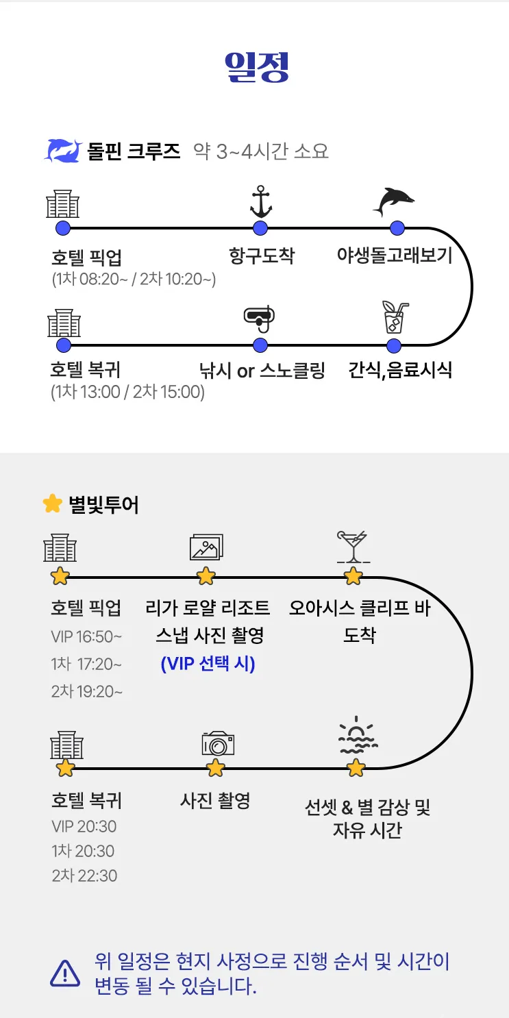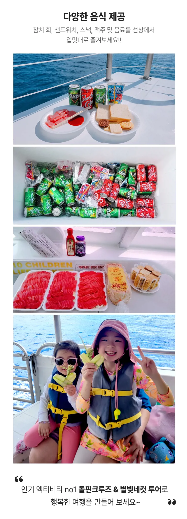 배 위에서 보는 바다가 참 이쁘고 바다 한복판에서 열대어들 보며 스노클링 하는 경험은 정말 재밌었습니다. 이번엔 돌고래를 보진 못했지만 돌고래 못보면 3년 이내 재방문시 다시 기회가 있으니 그때를 노려봐야겠어요. 참치회와 맥주 콜라도 충분히 준비되어 있어서 사람들이 다 가져간 후에도 남아있어서 한번 더 먹었구요 ^^ 특히 가이드(한국인, 현지인) 분들 센스가 넘쳐나서 효도여행이던 커플여행이던 친목여행이던 다 좋을거 같아요 ㅎㅎ 이번엔 어머님들이 많이 오셔서 노래도 맞춰서 틀어주시더라구요. 좋은 경험이였습니다.