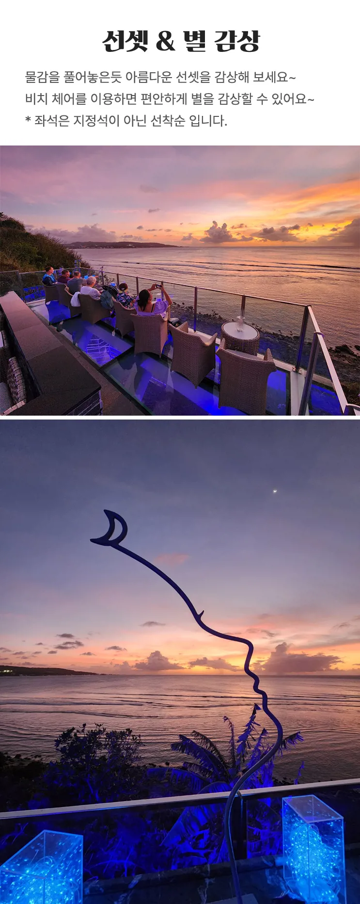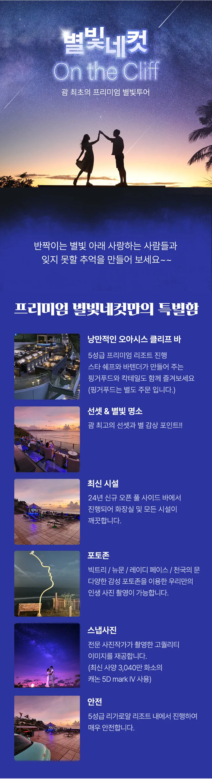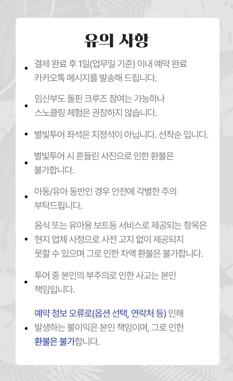괌에 처음 갔는데 돌핀+별빛 투어 신청하길 참 잘한것 같아요. 편하게 호텔에서 셔틀타고 다녀올 수 있고, 안내해주시는 분들도 너무 친절하셨습니다. 돌고래도 보고 스노쿨링도 하고 재미있어요. 사진도 찍어주셨다고 했는데 어디서 다운 받을 수 있는지 잘모르겠네요 ^^;; 끝나고 먹은 참치도 신선하고 맛있었어요. 별빛투어는 원래 2부 신청했었는데 작가님이 1부가 더 잘 나온다고 해서 스케줄 변경했는데 만족합니다. 사진도 이쁘게 잘 찍어 주십니다. 컵라면도 먹고 본사진 말고도 다른 포토장소에서 사진 잘 찍어주셔서 감사했어요. 괌에 오면 꼭 해보세요.