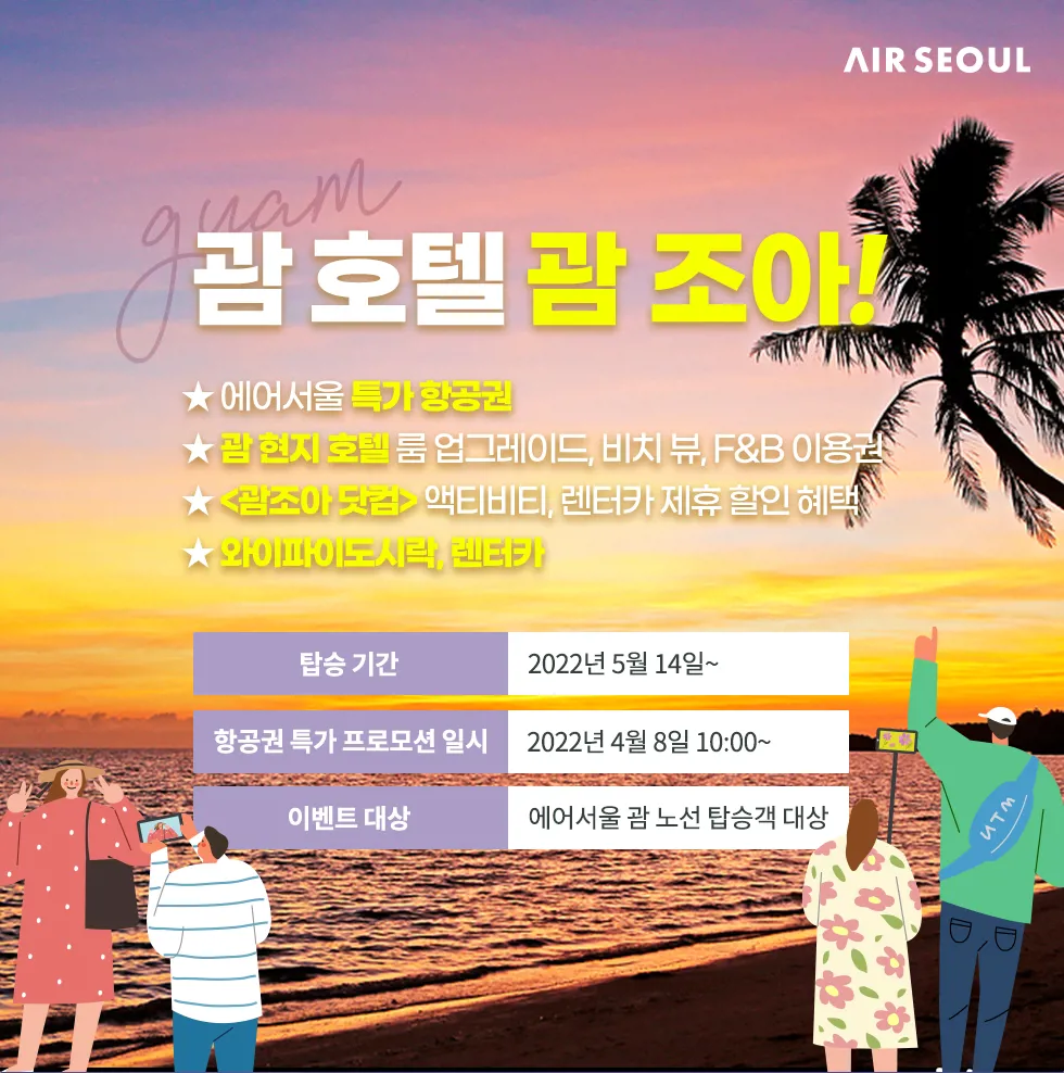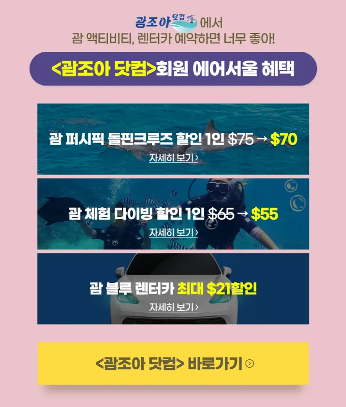안녕하세요 괌조아 미니미 입니다~에어서울과 저희 괌조아닷컴은 코로나 이전부터협력 업체로서 많은 이벤트를 진행 했었는데요~새롭게 열리고 있는 하늘길을 대비해서 새로운 이벤트를 들고왔습니다~그 이름 하여!! "에어서울 x 괌조아닷컴 초특가 프로모션"4월 8일 부터 시작 하는 이 프로모션은 에어서울 항공권 예약자 분들에게특별 할인 혜택을 주는 프로모션 입니다.야심차게 준비한 프로모션이니 많은 관심 부탁드립니다~